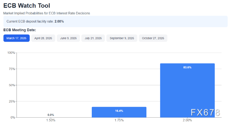 除了美国方面的动态,市场对欧洲央行的隐含概率显示,其在3月17日会议上维持利率于2.00%不变的概率为83.6%。此外,直至2026年10月,利率维持在中性区间的概率均保持在50%以上。这表明,与美国可能展开的局面不同,欧洲央行当前并未考虑开启激进的降息周期。